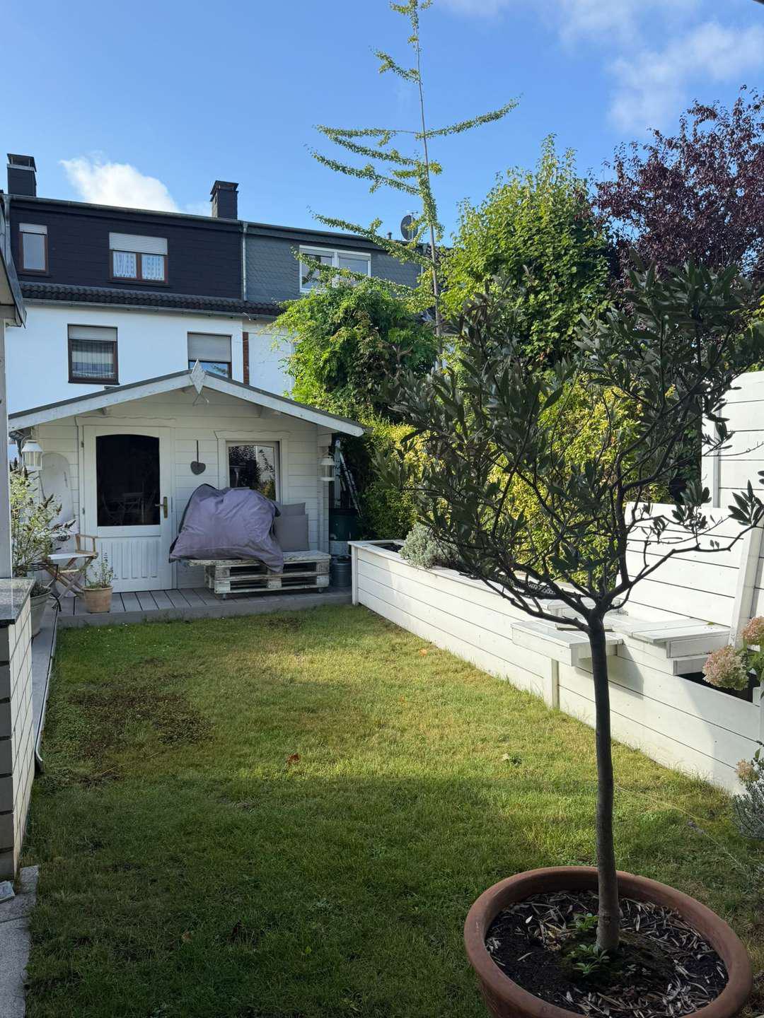 Ein schöner, wenn auch kleiner Garten lädt zum Verweilen ein und bietet mit einer angrenzenden überdachten Terrasse / Anbau zusätzlichen Wohnkomfort im Freien. Ein praktisches Gartenhäuschen sorgt außerdem für weiteren Stauraum.